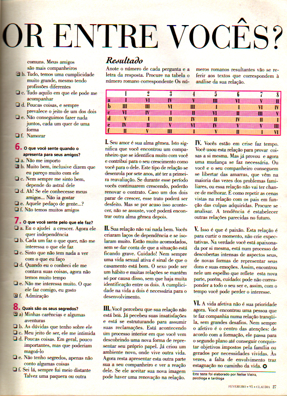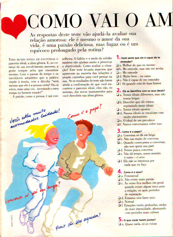 O artigo intitulado “Como vai o amor entre vocês?”, veiculado na Revista Claudia em Fevereiro de 1995, com contribuição de Nelise Carbonare, explorava profundamente a temática dos relacionamentos amorosos, lançando luz sobre métodos pelos quais as pessoas poderiam avaliar tanto a qualidade quanto a sustentabilidade de suas relações amorosas. Este destacado artigo apresentava um teste inovador que tinha como propósito explorar diversos aspectos comumente presentes na maioria dos relacionamentos, proporcionando insights valiosos acerca dos desafios inevitáveis e das sutis complicações que o decorrer do tempo pode introduzir.