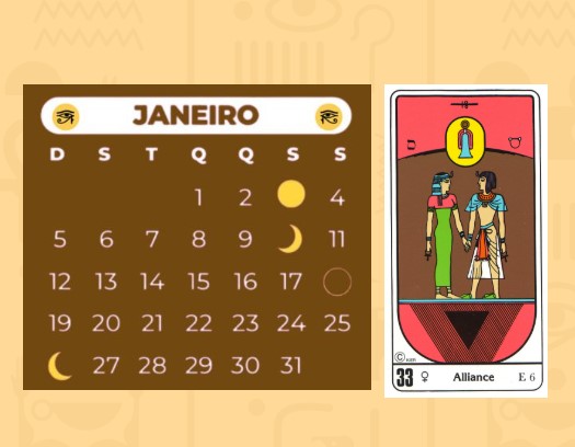 Calendário 2026 com fases da lua e previsões personalizadas de amor e trabalho para cada mês. Clique no baralho, receba sua folhinha e use como guia anual.